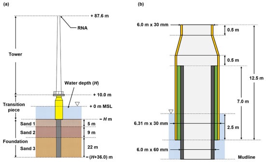 Dimensions of (a) NREL 5 MW and OC3 monopile embedded in layered sandy soil except for water depth and (b) detail of grouted connection.