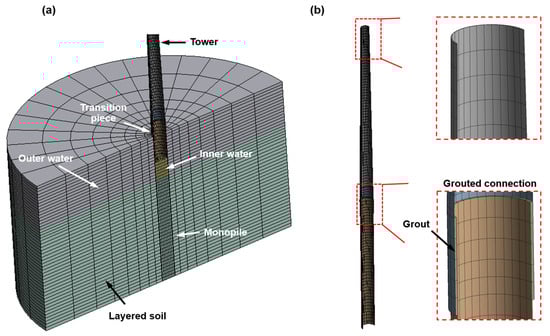 This section deals with the descriptions of modeling and verification of the FE model. Under the VNFD principle, the substructure type was selected as monopile because of the assumption that the bulky type containing the fluid inside the substructure is advantageous for application and the reason that the accumulated installed capacity is the largest among the offshore wind power substructure types [4]. The software used in the analysis was ANSYS 2021R1. A reference 5.0 MW turbine model of National Renewable Energy Laboratory (NREL) was used for reliability, and the specifications for mass and dimensions of RNA and tower are shown in Table 1 [35]. The weight of the RNA was applied as a lumped mass. The thickness of the tower is linearly decreased 0.027 m to 0.019 m. The dimensions of the geometry are shown in Figure 3. Since the parameter for the depth, H, was applied in this paper, it is denoted by a symbol in Figure 3a. The density of the tower material was set at 8500 kg/m3, taking into account bolts, paint, welds, and flanges, with a typical density of 7850 kg/m3 for steel [35]. The grout material is Ducorit D4 [36], and the details of the materials are shown in Table 2. Material strength is not described in this paper because the properties for linearity are considered and stress is not of interest. The soil was assumed to be a sand layer without clay, and the properties for each layer are shown in Table 3. The fluid was assumed to be sea water and had a density of 1025 kg/m3 [37].