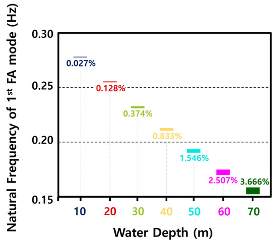 Figure 6 shows the natural frequency range by IWL change as a percentage. Overall, the deeper the water depth, the lower the natural frequency of the support structure linearly, and the lower the IWL, the higher the natural frequency nonlinearly, and this will be discussed in Section 4.2. The controllable range of natural frequency of the 10 m was about 0.027%, which was very small, but at a depth of 70 m, the relative frequency was 3.666%, which was relatively large. Since the splash zone was ignored and the external water level was considered constant, only the influence on the IWL was used as a variable.