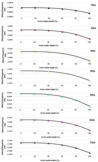 We can expect that the natural frequency will change non-linearly with a linear change of . Since all the variables constituting the term of Equation (8) are constants when the water depth, density of water, and the cross section of the substructure are constant, dominates. Figure 7 shows the natural frequency according to the change of IWL. The prediction that it would change non-linearly according to the change in was also found in the analysis results. Raising from 0.8 to 1.0 is about 3.7 times more effective than raising it from 0 to 0.2 in 10 m depth, while about 95.2 times more effective in 70m depth. Even if equal volumes of water are compared, it is clearly effective in deep water depth models.