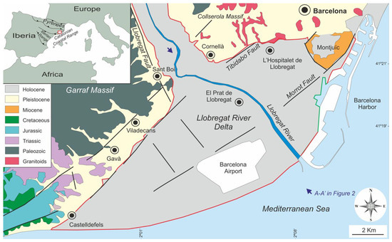 From a geological point of view, the LRD is regionally fed by the Llobregat River and its tributaries arriving from the Pre-Pyrenean Range and locally from the Llobregat River lower valley reliefs (Garraf and Collserola massifs) belonging to the Catalonian Coastal Range [23,24]. This range is a NE–SW-oriented mountain chain that gives pass downward to the Mediterranean coast (Figure 1). The LRD is also bounded toward the NE by the Montjuïc relief. The geological studies in the area started at the end of the XIX century by Almera [27]. In the previous century, several studies [18,19,20,28,29] allowed proposing geological maps and 2D cross-sections aimed to support hydrogeological studies. Sedimentological studies performed in the 1970s and 1980s [28,29,30] allowed clarifying the geology of the LRD. In the 1980s, the prodeltaic bodies of the emerged delta, dated as Holocene, were studied in detail [31] and the geological characterization of the continental shelf with support of 2D marine seismic reflection took place [32,33,34]. These studies, with a strong sedimentological component, allowed the sequential division of the LRD and the arrangement of the Quaternary materials. In the 1990s, this huge geological background was combined with the former geological information compiled from dozens of boreholes to make modern groundwater evaluations [35]. Coinciding with the PDL development at the beginning of the XXI century, new geological data allowed fine research [20,36,37,38,39] aimed to detail the 2D stratigraphic architecture of the LRD, thus giving a response to the Pliocene–Quaternary boundary, the confident definition of those coarse detritic levels officially cataloged as productive, high-yielding aquifers and the detailed identification of those interconnected stratigraphic structures (of sedimentary and tectonic origin) through which seawater intrusion into aquifers and mobilization of pollutants take place [22,23,26].