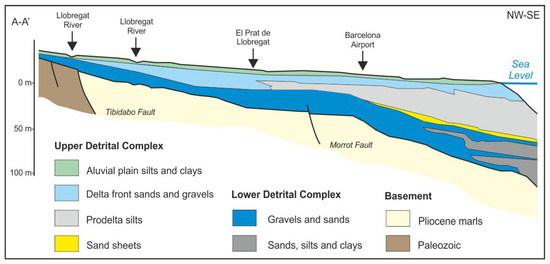 This area represents a Neogene rifted margin associated with the opening of the Valencia Trough and is affected by several fault families, probably active and mainly oriented NE–SW (Morrot and Tibidabo fault families) and NW–SE (Llobregat fault family), that conditioned the reliefs and the location of the Llobregat River outlet [18,19,20,21,22,23,24,25,26,27,28,29,30]. The Catalonian Coastal Range includes rocks of Paleozoic (granites and slates) and Mesozoic (Triassic conglomerates, sandstones, and pelites; Jurassic dolostones and limestones; Cretaceous marly limestones), whereas the Montjuïc Mount is made of Miocene calcarenites and marly limestones (Figure 1). Pliocene and older rocks are considered the basement, which is separated from the Quaternary formations by an important unconformity surface [20,38,39] (Figure 2). The Pliocene basement is made of estuarine marls, silts, and clays [18,19,20,38,39]. The Quaternary record was divided into two depositional sequences, the Pleistocene and Holocene ages [18,19,20,32,33,37,39]. The terms upper detrital complex and lower detrital complex have also been adopted in the scientific literature [20] for the same depositional sequences (Figure 2). According to geophysical studies in the offshore delta in the marine platform [32,33,34], the lower detrital complex can be divided into three parasequences [20]. In general terms, the lower detrital complex is made of conglomerate bodies (locally with sand) with intercalated silt- and clay-rich intervals [30,31,32,33,34]. The upper detrital complex, from bottom to top, is made of a sand layer, a silt bed, gravel (locally with sand), and upper silt and clay cover forming the current alluvial plain and the associated coastal wetlands and marshes [30,39]. The LRD coastal plain is also modeled by different streams coming from the neighbor reliefs [37,38,39] and the regional littoral drift, which distributes the shoreline sedimentation towards the SW [40,41].