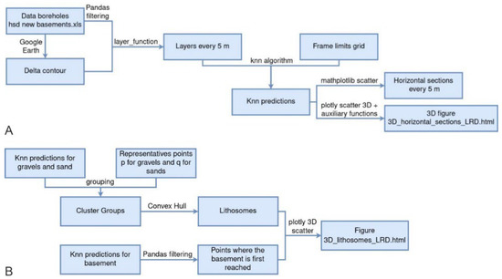 Next, the KNN algorithm was executed, and the matplotlib function scatter used to create the 2D horizontal layers with predictions bounded within polygonal regions. The Python Plotly function scatter3d was used to integrate the 2D predictions into an interactive 3D HTML model (3D_Horizontal_Sections_LRD.html (accessed on 12 July 2022)). Some auxiliary functions to arrange data in a specific format were used. This working flow is synthesized in Figure 3A. The Jupyter notebooks hosted in the GitHub repository as Supplementary Materials include the code.