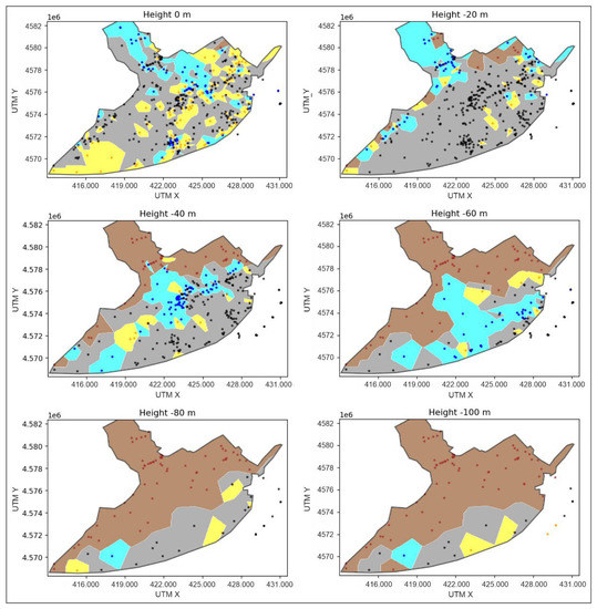 Some horizontal sections of the granulometry classes created with the KNN algorithm at 0, 20, 40, 60, 80, and 100 m below sea level in the onshore Quaternary LRD. The granulometry data were clustered into the gravel (>5 mm, cyan), coarse sand (1–5 mm, yellow), clay-silt (<1 mm, gray), and basement (brown) classes. The points display the boreholes with granulometry data at the modeled depth.