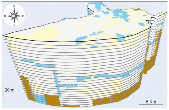 The consecutive 5 m-equispaced set of horizontal layers of the granulometry classes created with the KNN algorithm from 0 to 120 m b.s.l. in the onshore LRD. The color assigned to each granulometry class is cyan for gravel, yellow for coarse sand, light-grey for clay–silt and brown for the basement. An interactive 3D HTML version of this model is included in Supplementary Material (3D_Horizontal_Sections_LRD.html (accessed on 12 July 2022)).