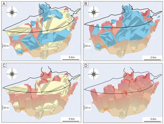 The 3D stratigraphic architecture (coarse lithosomes and the basement top surface (BTS)) of the onshore LRD. (A) Gravel and coarse sand lithosomes and BTS. (B) Gravel lithosomes and BTS. (C) Coarse sand lithosomes and BTS. (D) Basement top surface. The color assigned to each granulometry class is cyan for gravel, yellow for coarse sand, and reddish-brownish for the basement. An interactive 3D HTML version of this model is included in Supplementary Materials (3D_Lithosomes_LRD.html (accessed on 12 July 2022)).