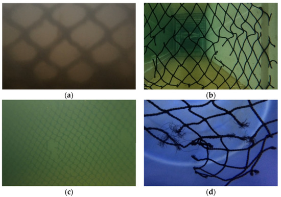 Sample images of damaged netting were taken under different conditions. (a) Real marine aquaculture. (b) With wave influence. (c) With still and turbid seawater. (d) With still and clear seawater.