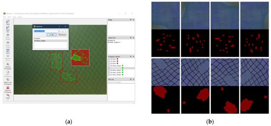 In order to generate training sample sets, we labeled the damaged netting images using LabelMe 4.5.9 (a project created by the MIT Computer Science and Artificial Intelligence Laboratory (CSAIL)) [30]. The process of labeling annotations and some training sample mask layers are shown in Figure 3.