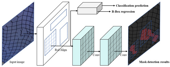 In the second stage, the RoIAlign layer properly aligns the feature map corresponding to each variable-sized RoI with the input and warps it into a fixed size. Based on this, object classification and bounding-box regression are performed by the fully connected (FC) layer, and object segmentation is also solved by the pixel-wise operation of images using a Full Convolutional Network (FCN) that outputs a binary mask for each RoI to achieve instance object segmentation, as shown in Figure 6.
