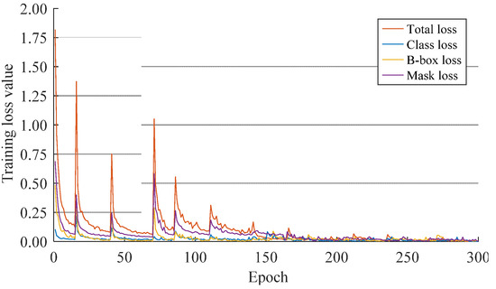where Lcls denotes the classification loss as defined in Equations (6) and (7). Lbbox denotes the regression loss of the detection bounding box as defined in Equations (8) and (9). Lmask denotes the average binary cross-entropy loss of the mask segmentation layer, as shown in Equation (10).