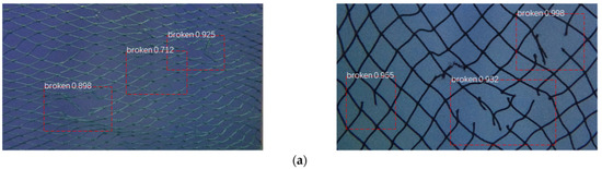 - Our proposed model combining Mask R-CNN, RFP, and DCN detects netting damage in both laboratory and actual marine environments. The missing detection rate of the final model is 7.12%, with an accuracy of 94.48%. The detection processes around 4.74 FPS while using about 231.8 MB of RAM, which satisfies actual application requirements and facilitates the deployment of this method in embedded equipment.