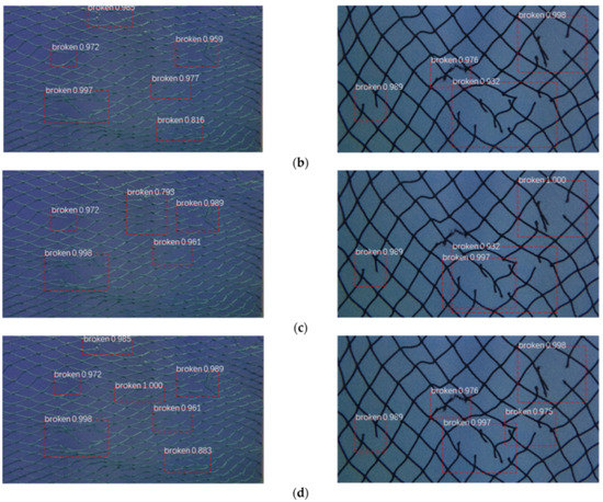 To verify the effect of the improvement of the netting damage detection model, Mask R-CNN was incrementally improved by adding RFP and DCN modules to form an extended model. Figure 11 compares the detection results of the model at each stage of the ablation experiment on the test dataset. Netting with a 1.2 mm twine diameter, a 1.5 cm mesh bar length, and multiple small-size damages are shown in the left column of the figure. Netting with a 3.0 mm twine diameter, a 3.0 cm mesh bar length, and an irregular damage are shown in the right column of the figure.