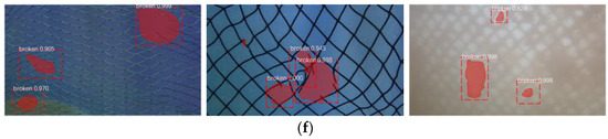 Figure 11 shows that the original model completed the detection of conventional damaged objects, but with inaccurate segmentation and localization of the breakage and several missing small-size objects. After adding the RFP module, the detection results of the model for small-size damage improved significantly with more accurate detection and localization of the damage. This result shows that the method effectively extracted low-level location features from the image and fused them with the high-level semantic features. It better solves the small-size damage which is difficult to detect by previous methods, such as the MobileNet-SSD framework proposed by Liao et al. [22]. The addition of the DCN structure made the convolutional kernel adaptively offset according to the damage shape features, extracting features more efficiently and enhancing the segmentation capability of the model for irregular damage feature masks. The detection results of the model with two improved strategies show that each damaged object was accurately located and finely segmented. Thus, the present model benefits from effectively combining the two improved strategies to solve the netting damage detection problem. In addition, we also analyzed the performance of each stage of the model according to the missing detection rate, average accuracy, F1 score, and detection speed, as shown in Table 4.