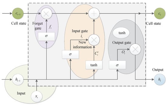 The network structure introduces a cell state which contains all the information at the last moment. When new information is encountered, a series of operations will be taken to choose between the old and new information. Coupled with the introduced “memory-forgetting” mechanism, the processing of long-term series data can be realized. The structure mainly includes input, forget, and output gates. The input are and , the output is , and the cell states are and .