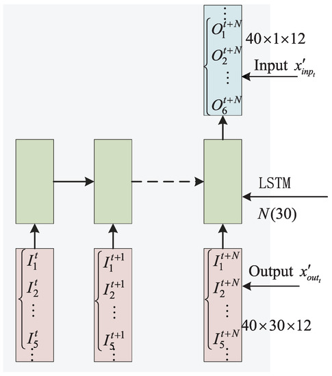 The structure of the LSTM-based AUV model is shown in Figure 3. The input elements of the input layer is , and the output of neural network is . The attitude and speed information of the next moment can be obtained by using the control instruction, attitude and speed information of 20 sets of time-series data. The learned model can be optimized according to the set loss function. More details of network architectures are described below.