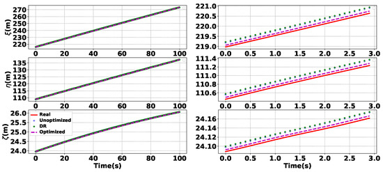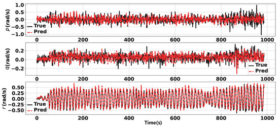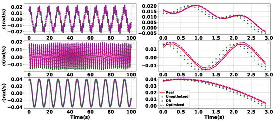 In order to further illustrate the advantages of this method, we compared the effect of the method before and after optimization with the commonly used DR algorithm. We compare the prediction results on the validation set optimized after 0 episodes and 100 episodes with the results predicted by the DR algorithm. The fitting curves of the network output and the real output of the AUV’s position, linear velocity, angle, and angular velocity are shown in Figure 10, Figure 11, Figure 12 and Figure 13, respectively. It can be seen from the figure that the optimized LSTM model makes the output of the 12 variables of the identification model have better agreement with the actual system output. In order to more clearly reflect the effectiveness of the method proposed in this paper, the MAE, MSE, and RMSE indicators of the prediction error are shown in Table 5. Compared with the unoptimized approach and DR, our method shows superior performance, with less MAE (28.42%, 29.13%), MSE (38.66%, 38.96%), and RMSE (21.70%, 25.81%). It can be seen that the deviation between the output of our method and the actual system is smaller than that of the other two methods.