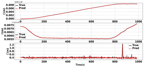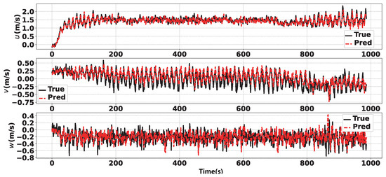 The fitting curve between the network output and the real output is shown in Figure 16, Figure 17, Figure 18 and Figure 19. The calculated MSE of the output error is 550.830181, and the MAE and RMSE values are 6.250734 and 23.469771, respectively. We can see that the LSTM neural network obtained by optimization can fit the system’s actual output and achieve high-precision recognition of AUVs. In order to illustrate the superiority of the method, it is compared with the commonly used dead reckoning (DR) method. The results are shown in Table 6, the proposed method provided 64.90% higher MAE, 64.20% higher MSE, and 37.76% higher RMSE than the DR method.