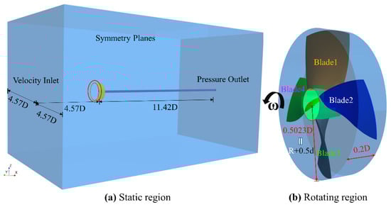 where Z is the number of propeller blades, AE⁄AD is the disc ratio of the blade, and D is the diameter of the blade. Based on the experimental values described in [25], the diameter D was taken as 218.87 mm, and the tip clearance d was taken as 1.01 mm. The specific parameters of the duct and propeller are presented in detail in Table 1, while the geometric model is shown in Figure 1.