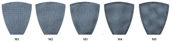 To perform mesh independence analysis, five meshes with different refinement levels were generated, as shown in Table 3, and the blade mesh diagram with different refinement levels was shown in Figure 4. The MRF approach and the IDDES model were employed for the numerical simulation to obtain the propeller thrust, torque, and duct thrust with J = 0.1–0.8. After non-dimensional processing, the OWC curves of the ducted propeller were obtained.