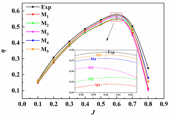 The experimental values of the efficiency η [25] and the η values of the five groups of different mesh resolutions were obtained. Their variations with the advance coefficient were plotted and compared with one another, as shown in Figure 6. The results showed that the simulation results of the efficiency approached the experimental values as the mesh quantity increased, demonstrating that the simulation results were convergent.