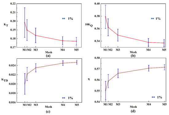 Open-water performance simulation results and error percentages with experimental values: (a) Change of KT with mesh number; (b) Change of 10KQ with mesh number; (c) Change of KTD with mesh number; (d) Change of η with mesh number.