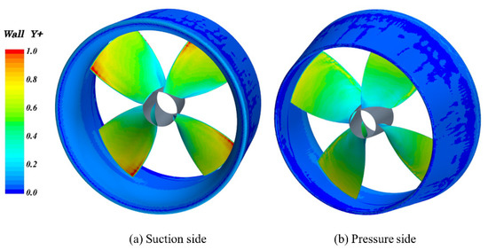 Figure 9 shows the y+ distributions on the ducted propeller. As shown in the picture, the average wall y+ of the duct and the blades is 0.2 and 0.6, respectively. Meanwhile, the y+ near the leading edges on the suction side is relatively higher than that of other areas. It is shown that all y+ values on the ducted propeller faces are well designed, and are generally less than 1.0.