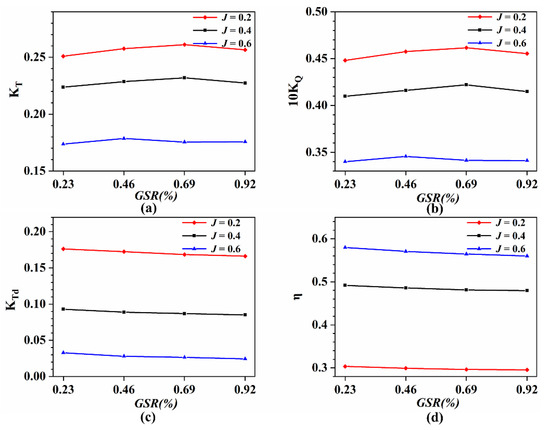 - With the increase in the GSR, KTD and η0 gradually decreased, and KQ and KTB increased, but with a turning point. At low advance coefficients (J = 0.2 and 0.4), KQ and KTB reached maximum values when GSR = 0.69, while at a high advance coefficient of J = 0.6, KQ and KTB reached maximum values at GSR = 0.46. Their turning point moved toward the smaller GSR as the advance coefficient increased.