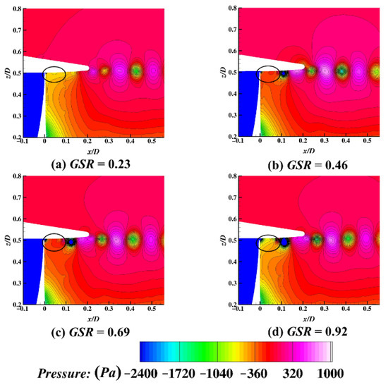 The pressure distribution on the propeller blades and the inner surface of the duct was obtained, as shown in Figure 12. The pressure values marked in black circles in Figure 12a,d were relatively small, while those in Figure 12b,c were relatively high. Since the thrust of propeller comes from the pressure difference between the pressure side and the suction side, when GSR = 0.46 and 0.69, the KQ and KTB values related to the blades had a significant increase, while at GSR = 0.92, they reduced instead. Due to the extremely small tip clearance, when GSR = 0.23, the TLV was scattered on the duct surface at a very early stage; thus, no significant vortex shedding area was observed on the inner wall of the duct, while the pressure of areas located in the suction blades of the other three cases was affected by the vortex shedding of the adjacent blades.