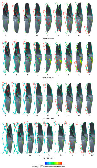 At GSR = 0.46 and 0.69, the vortex structures were relatively similar. Both essentially reached the maximum vortex development at time t0, and then began to attenuate and dissipate from t2 to t4. Finally, the vortex structures had mostly dissipated at time t5, and a new vortex appeared. When the GSR was large—namely, GSR = 0.92 in this simulation—the flow phenomenon was different from the other cases. At t0, the red arrow indicates that the STLV of the previous blade extended into the vortex system of the next blade and interacted with it. Due to its strong instability, this STLV gradually dissipated at t1 and t2, and it completely disappeared at t3. The influence of the STLV and the instability of the PTLV accelerated the dissipation period relatively quickly. However, its dissipation period was very long (from t2 to t6), and the vortex structure of the previous TLV in the upper row of red boxes dissipated very slowly. We speculate that the width and depth of this vortex were larger than those in the other cases.