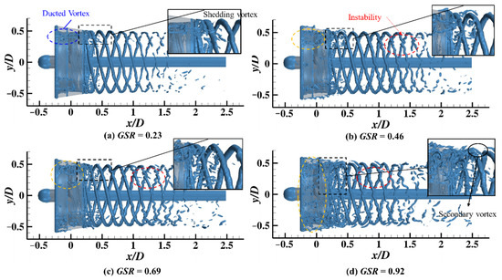 In order to study the effect of the GSR on the evolution and characteristics of the ducted propeller’s wake, the Q = 5000 s−2 isosurface was employed to capture the tail vortex region of the ducted propeller under different GSRs, and the results were compared. Complex vortex contraction in the ducted propeller wake occurred, as shown by the contours in Figure 14. A duct vortex (DV) on the outer surface of the duct, the PTLV, the STLV, and a duct shedding vortex were produced when the duct vortex met the TLV. Based on the results of the four cases, as the GSR increased, the duct vortex tended to be significantly stronger, and the shedding vortex system became more complicated.