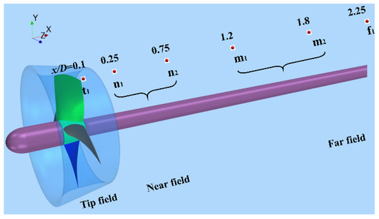 In order to study the effect of the GSR on the dynamic characteristics of the ducted propellers’ wake and the instability of the TLV, when the calculation of the ducted propellers with different GSRs reached convergence—namely, at t = 2 s—six wake detectors located at different positions of the ducted propellers’ wake were selected, and the physical quantity changes of these ducted propellers over three rotation cycles (2–2.2 s) were analyzed. Their longitudinal and circumferential positions were set to be the same—namely, z = 0 and y = 0.9r—and only the axial position changed. The specific locations of the probes are shown in Figure 15, where t1 is the monitoring point at the blade tip, n1 and n2 are the near-field monitoring points, m1 and m2 are the mid-field monitoring points, and f1 is the far-field monitoring point. The pressure p and their frequency-domain distributions were calculated.