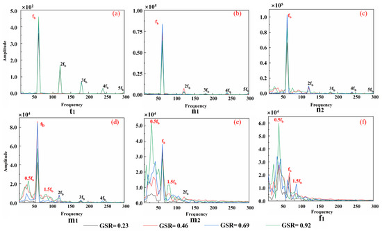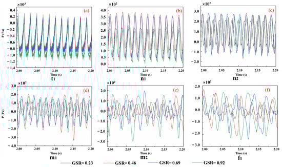 At the tip monitoring point t1, the GSR’s influence on pressure mainly manifested in its fluctuation amplitude, as shown in Figure 17a. With the increase in the GSR, the pressure fluctuation amplitude gradually increased, indicating that the TLV stability decreased with the increase in the GSR. Overall, a significant peak at nfb was observed in the pressure spectrum, indicating that the main characteristic frequency of the tip vortex of the ducted blade was the blade-passing frequency. In the near-field, the pressure fluctuation amplitude increased with the increase in the GSR; in the mid-field, while GSR = 0.46 and 0.92, the process of the frequency shifting from fb to low frequency was more significant; in the mid-field and far-field, with the increase in the GSR, the stability decreased, and the transition area from fb to the low frequency was advanced. At the same monitoring point, the amplitude of the low blade frequency increased relatively as the GSR increased. When GSR = 0.92, the pressure frequency amplitude had a sharp peak at 0.5fb, and exceeded the peak values of fb in m2 and f1.