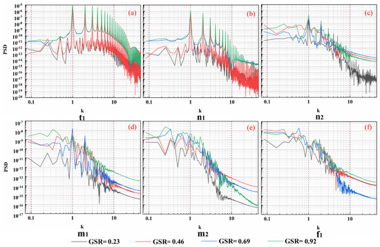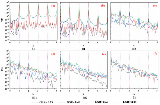 Diagram of power spectral density (PSD) at the measuring points: (a) The PSD distribution at t1 measuring point; (b) The PSD distribution at n1 measuring point; (c) The PSD distribution at n2 measuring point; (d) The PSD distribution at m1 measuring point; (e) The PSD distribution at m2 measuring point; (f) The PSD distribution at f1 measuring point.