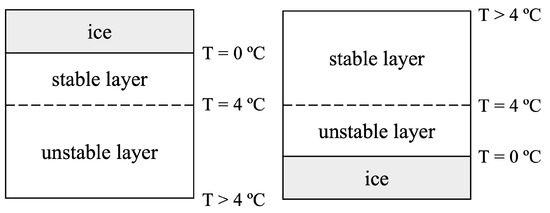 This behavior of the density surrounding the temperature of maximum density (TMD) results in different configurations of stable or unstable stratified layers. For scenarios with floating ice, a stable density stratification exists for which 0 °C °C, where T indicates water temperature, whereas for °C, an unstable lower density stratification exists, as shown in Figure 1. Similarly, ice affixed at the bottom of a water tank will generate an unstable stratification in the layer adjacent to the ice for 0 °C °C, whereas the upper layer ( °C) will remain stably stratified.