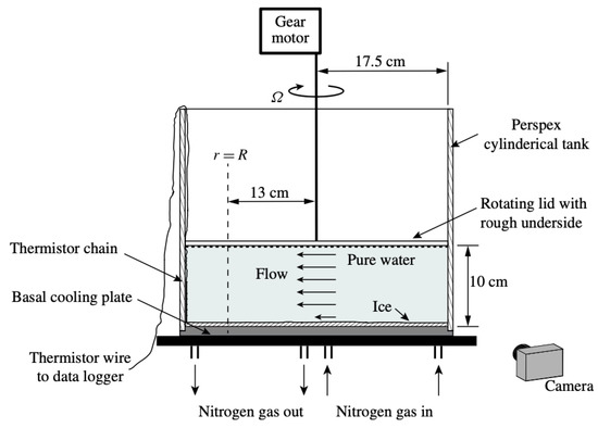 A schematic of the apparatus of [65], reproduced with permission from Cambridge University Press (2016), with a rotating lid to produce turbulent flow above an ice sheet located at the bottom of the tank.