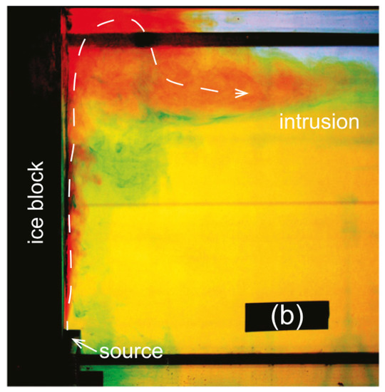 Cenedese and Gatto [128] conducted experiments using a two-layer salinity- and temperature-stratified flow to understand submarine melting and meltwater export by varying subglacial discharge at a vertical ice-water interface. The subglacial plume was comprised of nearly freezing fresh water, dyed red, released as a single point discharge at the base of the ice block (Figure 6). The experimental apparatus was a rectangular tank of 150 by 15 by 30 cm with triple-paned glass filled with argon and located in a cold room. The stratification was similar to that found in the Sermilik Fjord [129]. The bottom stratified layer had a depth of 20.5 cm at 3 °C and a salinity of 34‰. The top layer had a depth of 5 cm at 0.5 °C and a salinity of 32‰. The ice block (l = 10 cm, w = 15 cm, h = 30 cm) was degassed and dyed blue. When exposed to the discharge plume and warmer ambient water, the temperature of the ice block rose from −21 °C to −3.5 °C after 30 min, and ultimately to a constant −1.6 °C after one hour. The flow rate values of the discharge plume used were 0, 0.6, 1.1, 2.3, and 3.4 cm s. While in a natural ocean environment, this source would not be completely vertically oriented; due to the Coanda effect [130], the discharge would attach to the vertical ice face and have negligible horizontal momentum, suggesting an appropriate laboratory-based model. Horizontal flow velocity was determined via analysis of time-lapsed photographs of purple streaks from potassium permanganate crystals released into the water. Along the ice-water interface, there was observed a region of convection-driven melting, where the discharge was the main buoyancy source [11]. The results showed submarine melting to increase with greater rates of forced discharge. The laboratory results of the melting rate compared well to a heat, salt, and mass fjord budget method developed by [20].