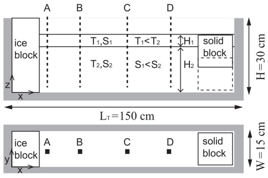 Top and side views of an experimental facility with a stratified flow and solid block that moves up and down to produce intermediary circulation along a vertically-oriented ice wall. The letters A to D and the dashed lines indicate the location of conductivity-temperature probes. Reproduced from [133], with permission from John Wiley and Sons, 2014.
