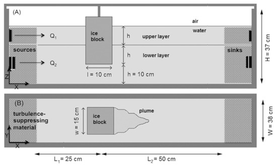 To continue the study of how iceberg melt occurs, ref. [136] performed experiments to investigate ice blocks melting in two-layered vertically sheared flow with ambient water temperatures from 18 to 21 °C. An ice block was submerged in 30 cm of saline water (‰) with the top and bottom half of the block positioned in the upper and lower layers, respectively (Figure 8). The sheared flow was generated in a recirculating flume of width 38 cm and length 200 cm by using two pumps that controlled the flow rate for the top 10 cm and bottom 20 cm of the water in the flume. The shear layer was 5 cm thick. To keep the flow laminar outside of the shear layer, turbulence-suppressing foam and honeycomb lattices were installed upstream of the ice. The two flows varied from 0, 1.5, 3.3, and 3.7 cm/s. Melting was separated into three distinct zones of upstream, downstream, and basal components, determined via analysis of video footage from melting tests. Ref. [136] found in ambient vertically sheared flow that when the flow speed was vertically averaged in the side melt parameterization of [135], the predicted submarine side melt rate was underestimated, thus necessitating the need for more experiments to determine the needed correction for parameterizing the melt rate. Analysis of observations of 90 icebergs in a Greenland fjord in the study indicated the average underestimation to be 21% for iceberg side melt rates.