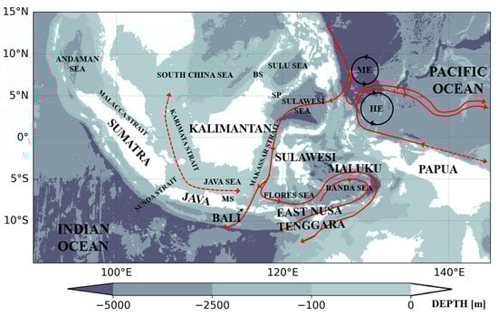 Indonesian region bathymetry, main islands and currents. Shades of blue-gray illustrate the bathymetry (in meters). Red lines and arrows illustrate the Indonesian throughflow. Dashed lines illustrate two currents reversing with the monsoons (southeastward during the North Monsoon centered on July and August and northwestward during the South Monsoon centered on January and February). Acronyms: ME, Mindanao Eddy; HE, Halmahera Eddy; BS: Balabac Strait; SP: Sibutu Passage; MS, Madura Strait.
