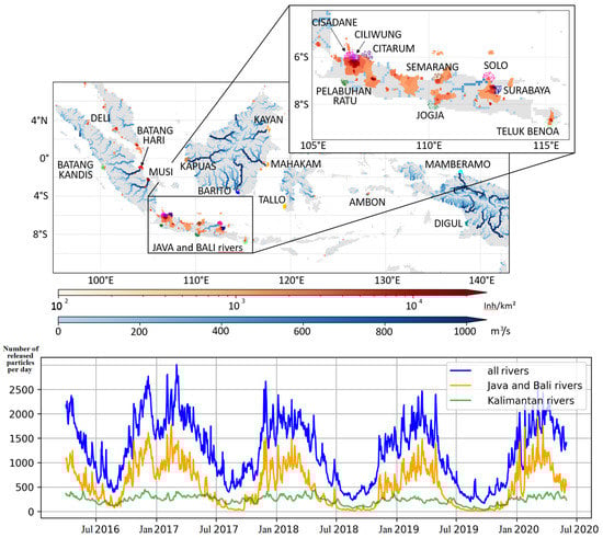 Spatial and temporal characteristics of the source scenario. Upper panel: names and locations of the 21 rivers selected to release particles in the simulation. River discharges [] are indicated in shades of blue and population density [inhabitant/km2] in shades of orange. Colored dots indicate the particle release position on the first day of the simulation. The colors differentiate the riverine origins. See [] for detailed coordinates of river mouths. Lower panel: time series of the sum of released particles for all 21 rivers (blue line), the 9 rivers of the islands of Java and Bali (orange line) and the 4 rivers from Kalimantan (green line). The daily number of released particles linearly follows the river discharge evolution. This relationship is detailed in see Section 2.2.2 on the “river source scenario”.