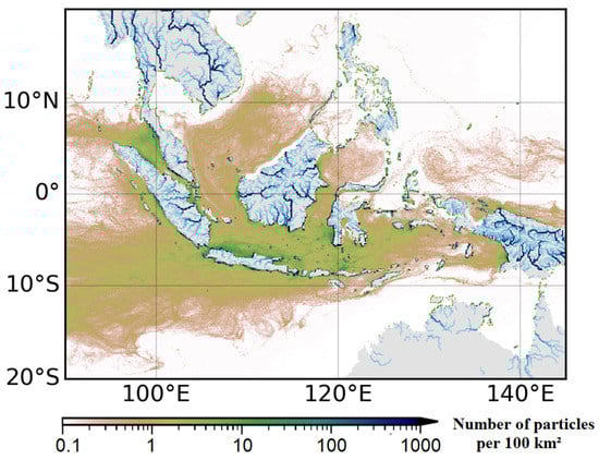 To assess waste stranding and dispersion in the Indonesian region, a Lagrangian simulation was performed. The Lagrangian point of view allows multiple analyses of particle trajectories (e.g., []), including covered distance, drift time, stranding location, connectivity patterns between regions, backward analyses and probabilistic analyses. We used the Lagrangian software package Ariane, originally developed by B. Blanke and S. Raynaud [], available at www.univ-brest.fr/lpo/ariane (accessed on 9 June 2022); it was released by the Laboratory of Ocean Physics and Satellite Remote Sensing (LOPS, France) and has been maintained since 2006. Ariane software computes trajectories from a 1D linear formulation using input 3D current fields and builds water mass transport diagnostics. More specifically, on the latter point, Ariane ensures the conservation of mass attributed to the elementary particle flowing through each numerical cell. The implication of this conservation of mass means that it avoids the necessity of considering random-walk modeling or any type of diffusion in addition to the trajectory computation. The present approach thus represents a purely kinematic method associated with the stirring conditions of the current (other methods and codes are discussed by []).