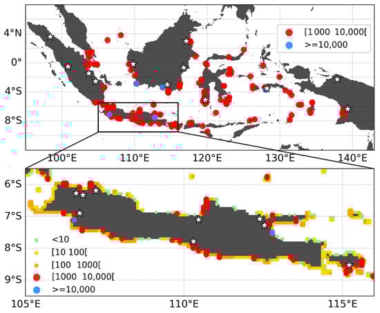 Locations of stranded particles along Indonesian coasts. White stars indicate the riverine sources. The upper panel shows locations where more than 1000 and more than 10,000 particles were stranded on the same coastal numerical segment 5 km in length. The lower panel focuses on the islands of Java and Bali.