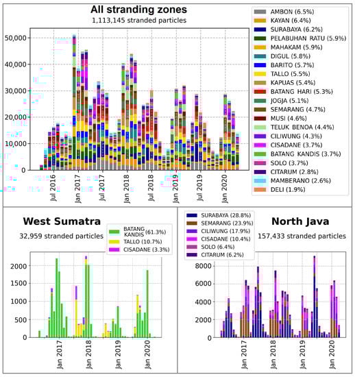 Time series of particle strandings along the coasts of the entire region (upper panel), West Sumatra (lower left panel) and North Java (lower right panel). Note that the ordinate axis range differs between the three panels.