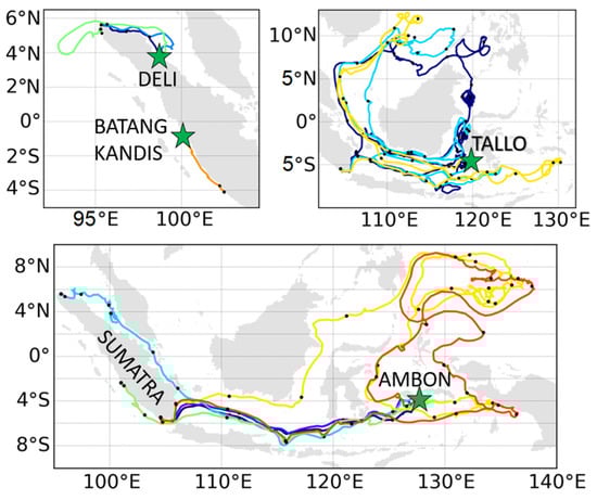 Examples of trajectories (in differentcolors per particle) of particle stranding along the western coast of Sumatra. Trajectory origins are indicated by green stars associated with the respective names of the rivers. Successive black dots illustrate 30-day intervals along each trajectory. The upper left panel shows the stranding location of locally released particles. The other two panels illustrate trajectories of particles with remote origins and long drifts.