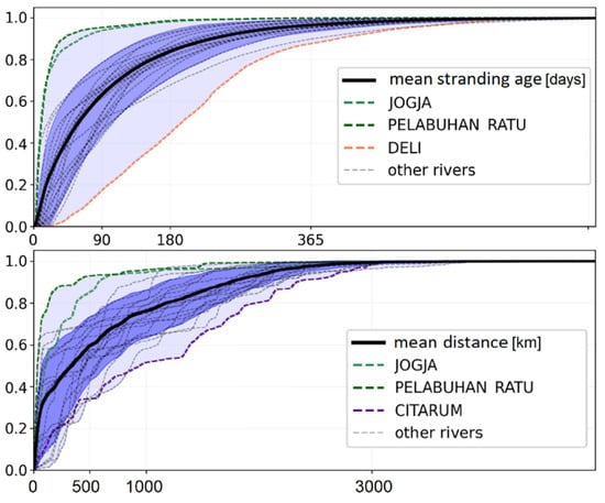 Upper panel: normalized cumulative sum of stranding ages for particles released from 21 Indonesian rivers. Bottom panel: normalized cumulative sum of the distances between particles’ initial locations and stranding locations. For both panels, the thick black line represents the normalized cumulative sum for all stranded particles, regardless of the riverine origin. The dashed lines correspond to normalized cumulative sums of stranded particles originating from a given riverine source. The extreme patterns displayed by the Jogja, Pelabuhan Ratu, Deli and Citarum rivers are highlighted with colored dashed lines. The dark purple shading corresponds to the standard deviation with respect to the riverine source. The light purple shading highlights the minimum and maximum values.