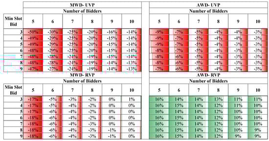 Insufficient Supply Scenario: Under this scenario, we assume that the number of bidders is equal to twenty. Under this scenario, and for the cases where the minimum slot bid for any bidder is greater or equal to eight, the available slots are not enough to satisfy the demand for all bidders. The rest of the assumptions remain the same as in the base scenario. This additional scenario is used to evaluate the effects of insufficient supply.