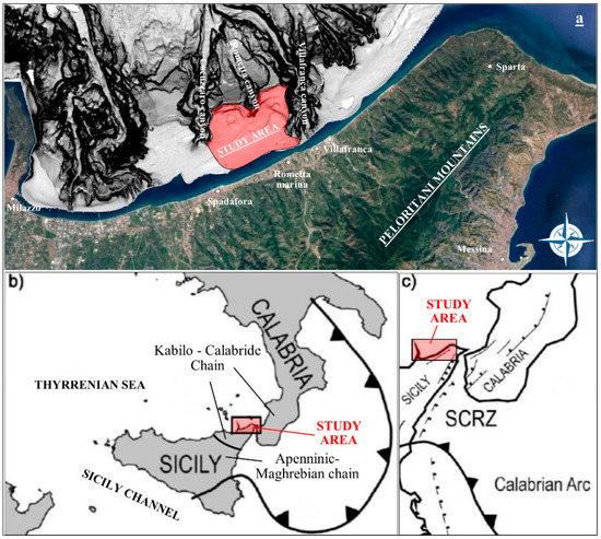 The Peloritani Mountains are cut by ramps linking with a floor-thrust underlying the Kabilo-Calabride Chain; this crops out at the southern margin [24]. The geometry of the thrusts has been partly modified by recent dextral strike-slip faulting, connected to regional collisional tectonics that displaced pre-existing tectonic elements. Within this complex tectonic setting, the largest tectonic feature of the Calabrian Arc is the Siculo-Calabrian Rift Zone (SCRZ; Figure 1c), a 370 km long belt that runs continuously along the inner side of the Calabrian Arc [25,26]. The tectonic pattern controls the development of the hydrographic network of the northeast of Sicily, with rivers that are short with small drainage basins on the eastern side and become progressively longer with larger drainage basins to the west [26].