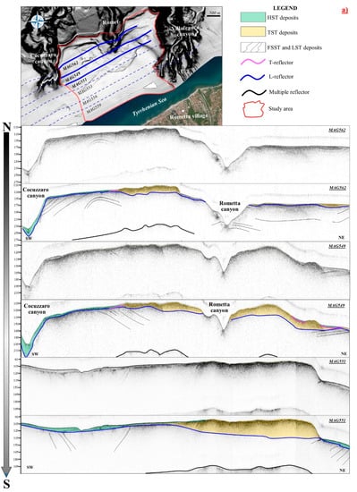 In the northern portions, the analysis of the MAG562, MAG549 and MAG551 profiles reveals the acoustic facies and the-stratigraphic setting of the LST deposits (Figure 3a). Here locally the reflectors show a discrete continuity and a depositional setting that varies from sub-vertical to sub-horizontal and/or slightly wavy. Upwards, these reflectors are always cut by the erosive surface corresponding with L-reflector. The LST succession is interpreted as being characterized by the foreset of the prograding clinoforms of the northeastern Sicilian continental margin.