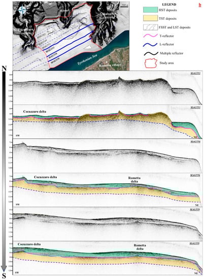 The first main reflector (named here L-reflector) is laterally continuous and has an erosional character and is the top of the lowstand succession and the base of the transgressive wedge. The L-reflector is well-imaged, especially in the northern portion of the study area (MAG562 and MAG549; Figure 3a). Conversely, in the central portion and moving towards the coastline, the L-reflector and the underlying deposits are rarely imaged due to the coverage of coarse deposits of the TST succession that do not allow for the penetration of the acoustic signal.