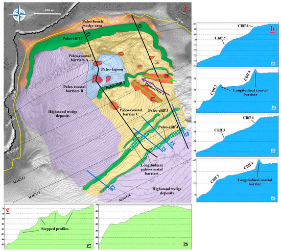 (a) Mapping of the main geomorphic elements outcropping on the seabed of the western sector of the study area, with particular focus on the relict Transgressive System Tract deposits. (b) The P3, P4, P5 and P6 bathymetric profiles, about orthogonal to paleo-cliffs 3 and 4. (c) The P7 and P8 bathymetric profiles about longitudinal to the paleo-river 1 delta.